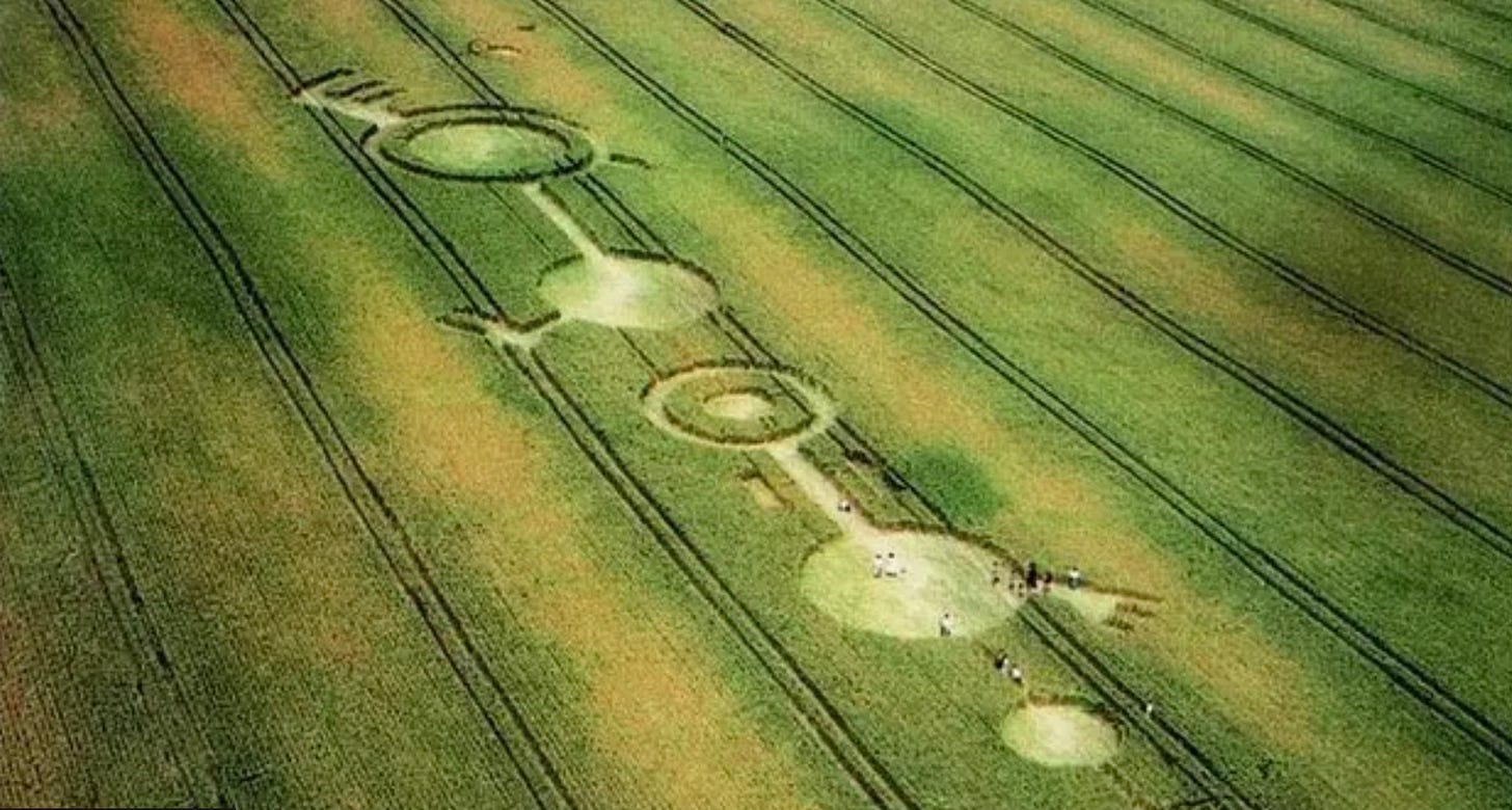 Apparently alien life-forms had landed at the foot of the hill and carved elaborate patterns into the wheat fields below.